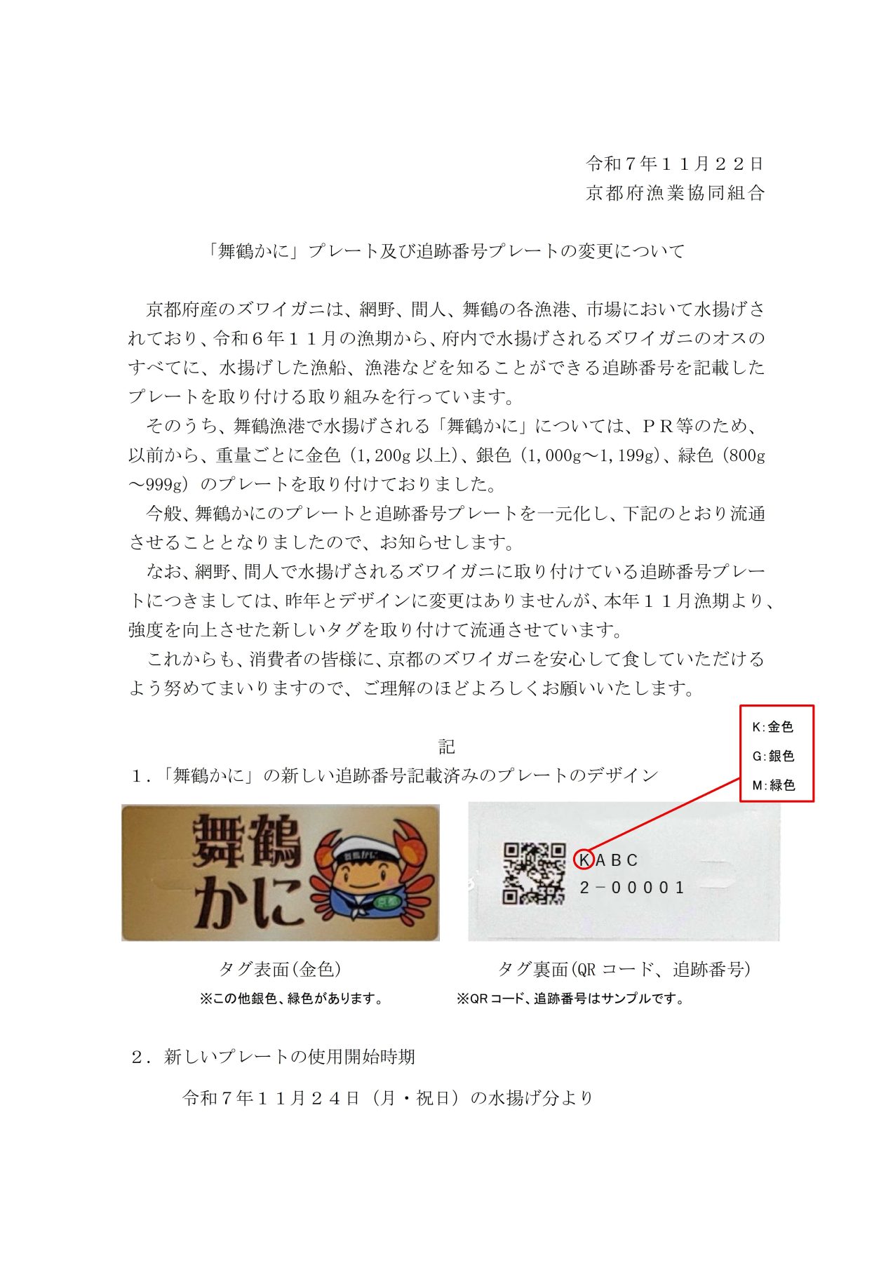「舞鶴かに」プレート及び追跡番号プレートの変更について