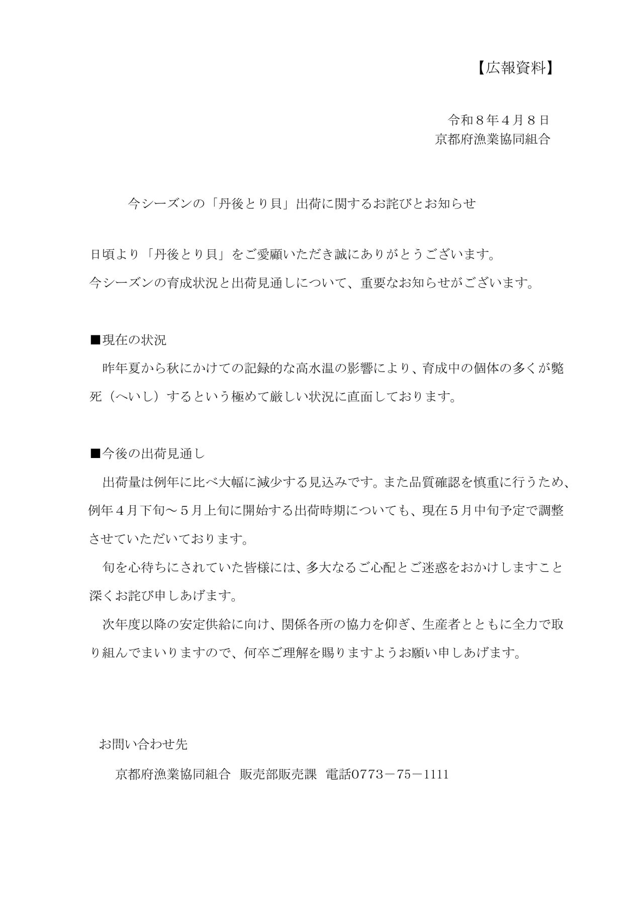 令和8年度「丹後とり貝」の育成状況および出荷見通しについて
